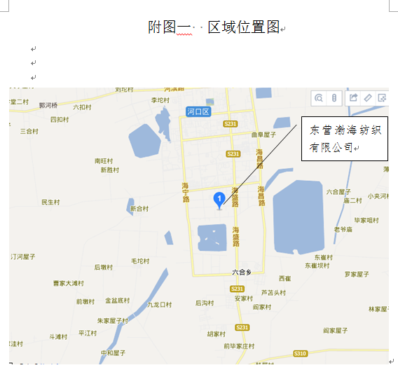 東營渤海紡織有限公司位于東營市河口區(qū)海河路以西、陽河路以北,占地面積100畝。廠區(qū)所在地南面為陽河路,距離為20m,廠區(qū)西面為東營市布萊特石油裝備有限公司、東營市三鎮(zhèn)服飾有限公司,距離大約15m;東面為海河路,距離大約為20m,海河路以東為金色河口(集團(tuán))新型材料有限責(zé)任公司、預(yù)制砂漿廠、東營建友新型材料有限公司、匯昶飼料廠和東營市廣和化工有限公司),距離為80m;北面為金河路,距離大約為20m,金河路以北為東營市大中南實(shí)業(yè)有限公司,距離大約為120m。 |