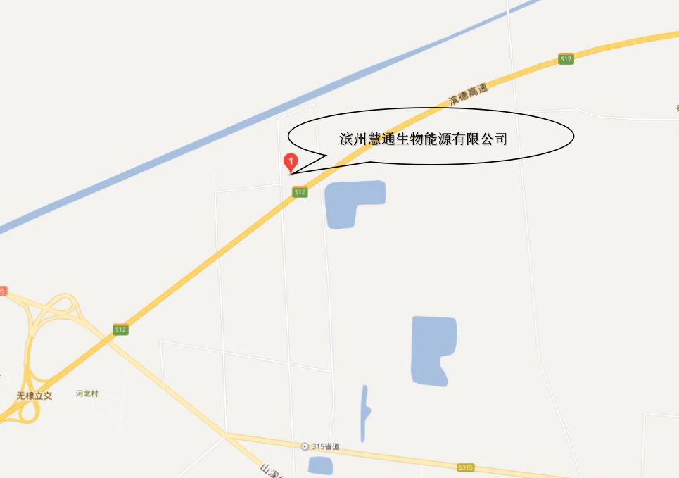 濱州匯通生物能源有限公司與高清瑞雪印務有限公司(石油化工企業)在同一個廠區內。廠區北側為山東鑫諾污水處理廠(一般企業);東側為開發區路;路南為濱德高速。廠區西北側一條東西走向的架空電力線引至廠區西北側的變配電室。廠區據東北側的大王村約2000米。