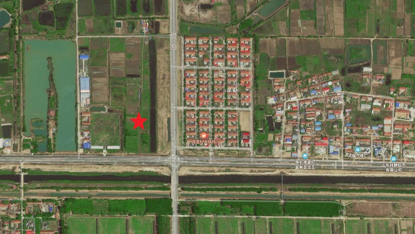 該項目距離東側民豐路路邊46m,該加油站位于東營市墾利區德州路與民豐路交叉口西北側。東側為民豐路,用地邊界距路邊46m,路東距用地邊界約100m處為高蓋村(人口約800人),其村內幼兒園距站區邊界約720m。南側為德州路,用地邊界距路邊8.5m,路南為空地。西南方向約400m處為王營村。西側為樹林,北側為空地。