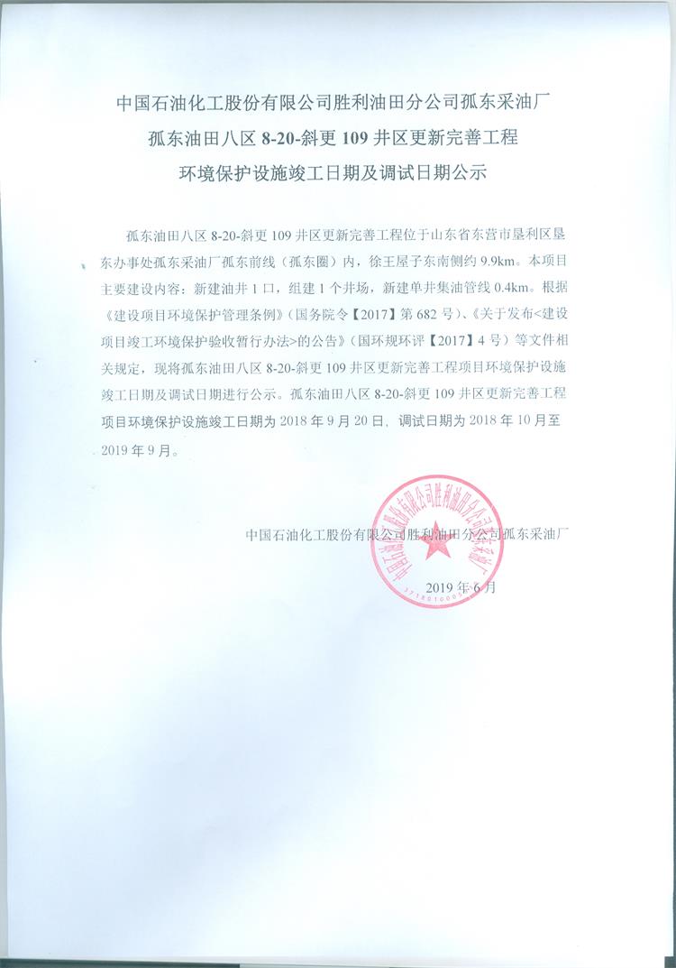中國石油化工股份有限公司勝利油田分公司孤東采油廠孤東油田八區8-20-斜更109井區完善工程環境保護設施竣工日期及調試日期公示